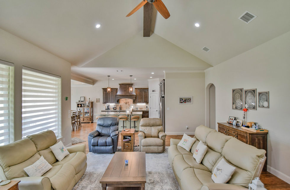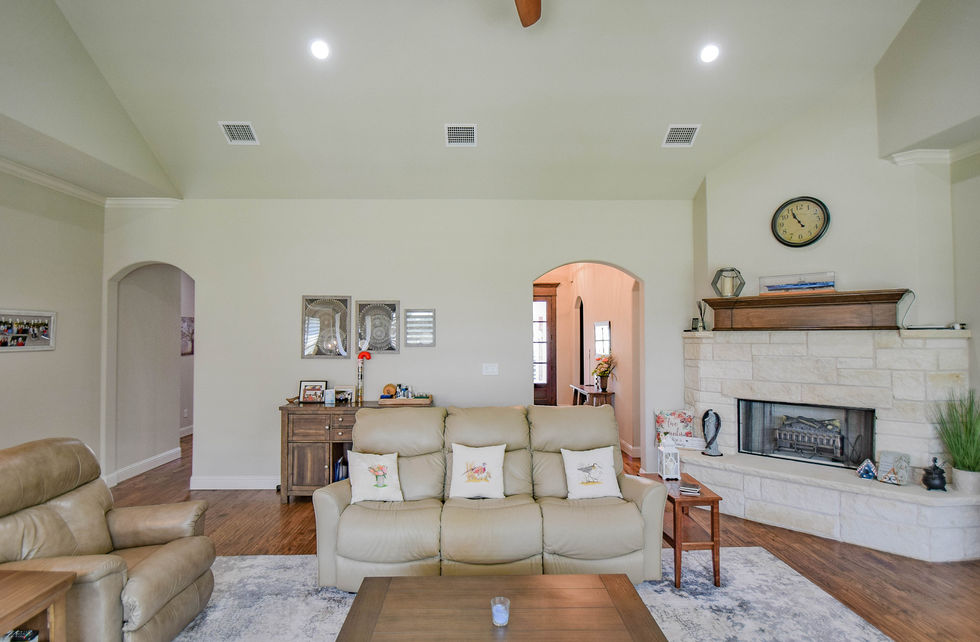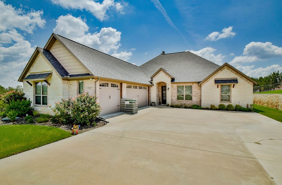 Situated on a corner lot in prestigious gated community of DeCordova Ranch, this 4 bed, 2.5 bath custom home features exceptional open floor plan, modern fixtures, vaulted wood beam ceiling, stone fireplace, arched entryways, & abundant natural light throughout. Prepare meal in eat-in kitchen boasting dbl oven, granite countertops, island, pot filler & walk in pantry situated off breakfast room. Relax in Master complemented by seating area, tray ceilings, & master ensuite bath w- separate vanities, walk-in tile shower, w- dual sprayers, dressing table, deep garden tub & oversized walk in closet- conveniently located off utility rm. Work from home in office w-with french doors & storage closet or Relax outdoors on covered patio overlooking large private backyard. A Separate workshop with garage door, work bench & shelving for added storage. Just minutes from shopping, dining, & Lake Granbury, this tranquil property is a must see!